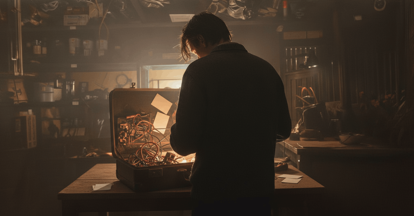 Ослепительная, белая, беззвучная. Сетчатку выжгло изображение скелета лампы на мгновение впечаталось в сознание. Гудение оборвалось, свет погас, и в наступившей тишине я услышал лишь частый стук дождя по крыше и... тихое, механическое шуршание внутри чемодана.