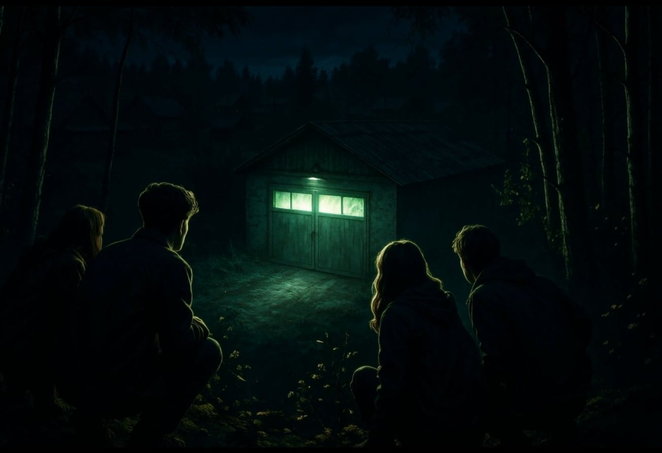 «...Да... похоже...» — я всмотрелся в гараж. Он был приоткрыт, и внутри горел свет. — «Но кто там в час ночи?»